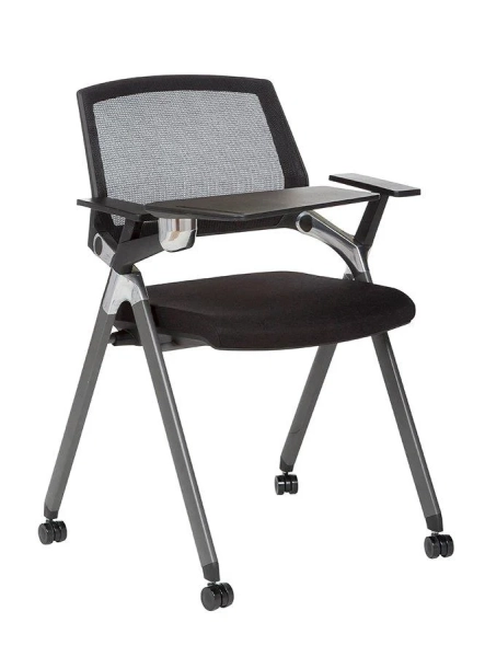 כסא איכותי לחדרי הרצאות/מתנסים/כיתות לימוד גב בד רשת שחור, מושב מרופד בד שחור, על גלגלים, ידית מתקפלת