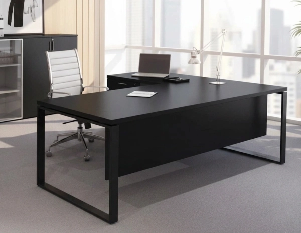 שולחן עבודה במידות שונות, מונח על רגלי מתכת בצורת חלון, כולל מסתור לרגליים,