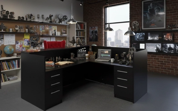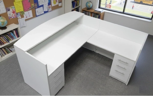 ייצור עמדות עבודה/קבלה בהתאמה אישית, גימור מלמין 28 מ"מ, כולל  ארונית אחת עם 4 מגירות .