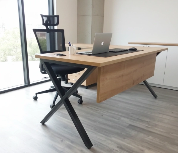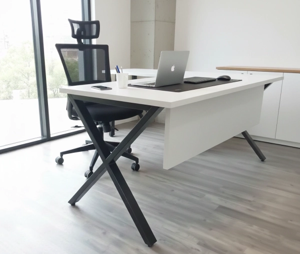 שולחן עבודה פינתי משולב רגל מתכת בצורת איקס, כולל רתומה בצד ימין/שמאל
