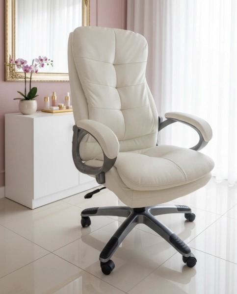 כסא עבודה /כיסא לחדר ישיבות/כיסא מנהל ריפוד דמוי עור לבן, משענות ידיים מרופדות מנגנון נידנוד, בוכנה לשינוי גובה