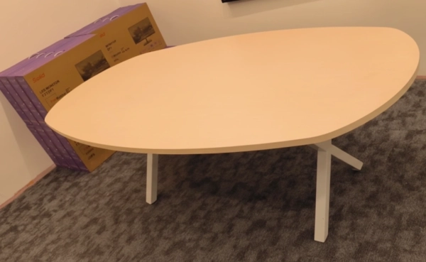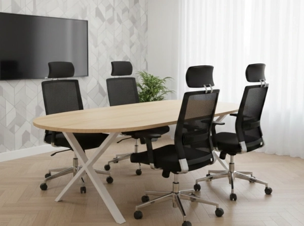 שולחן ישיבות גדול 220/110 , אובלי פלטה גוון מייפל 5608, עובי 28 מ"מ, רגלי ברזל דגם איקס לבן
